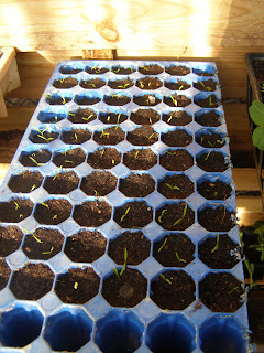 3- Je dépose une graine (elles sont petites) dans chacune de ces dépressions.Je préfère mettre deux graines par alvéole pour assurer une levée proche de 100 %. Ensuite je garde la plantule la plus vigoureuse et retire l'autre si besoin.